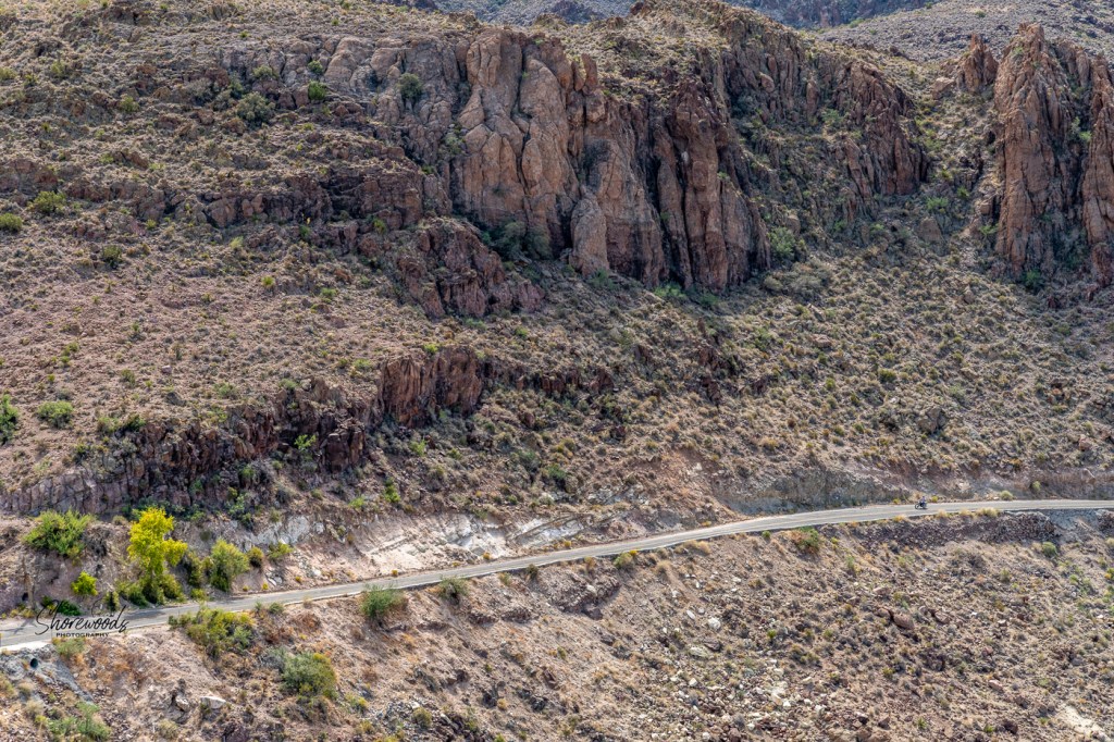 To give you an idea of the size of the cliffs and rock formations, there is a motorcyclist entering the photo on the lower right side.