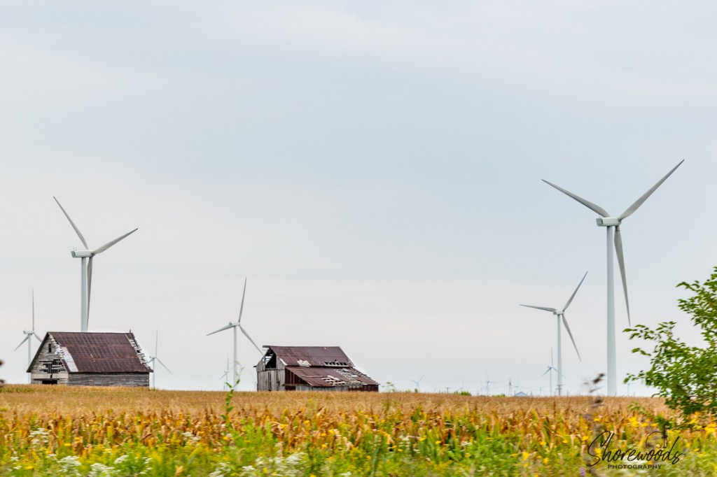 We drove through a large wind farm, with turbines on each side of the road. these old farm buildings were a stark contrast of old and new.