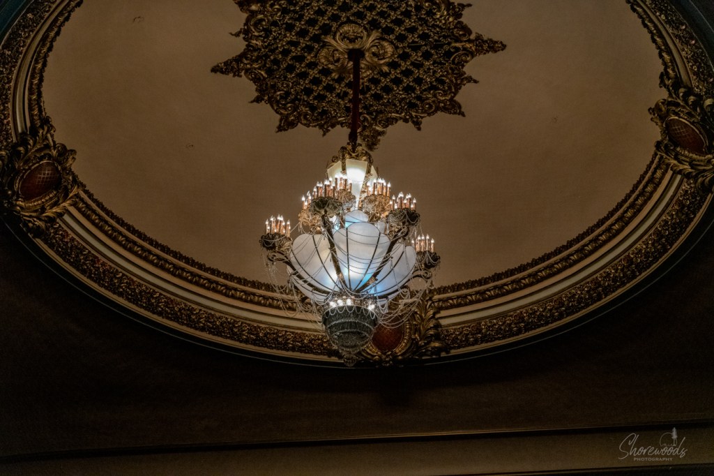 At the top of the theatre is a striking chandelier; in disrepair with the glass broken, the renovators were able to locate a glass company who remade the glass. A descendent of the original artisan who installed the chandelier, rewired and installed the centerpiece of light. Once a year it is lowered from the apex of the ceiling to the balcony level where light bulbs are changed and the crystals and glass are cleaned before it is cranked back up to the ceiling.