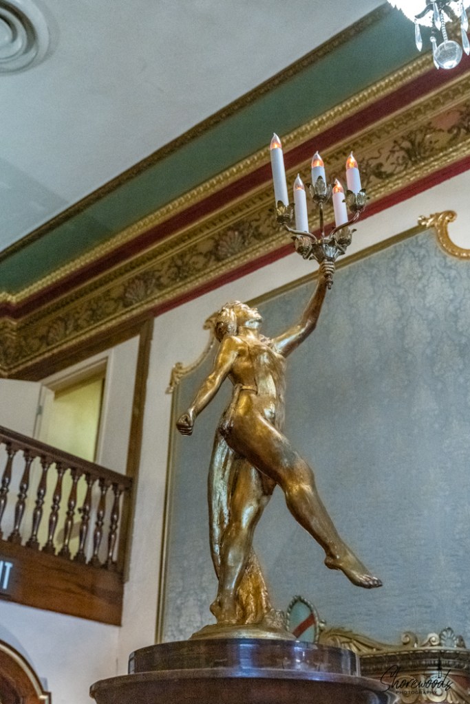 Beautiful regal staircases grace the lobby. Karen told us of how the ushers, dressed in their suits, would descend the stairs. The tradition was, as the ushers came down the steps they would touch a gold statue of a woman holding a candelabra, for good luck. When the theatre was undergoing renovation, the statue was missing. A former usher during the Coleman’s time, said he would pay for the restoration of the statue if it could be found. It was found with some damage, and the gentleman paid to have the statue restored as it once was, and graces the same spot today.