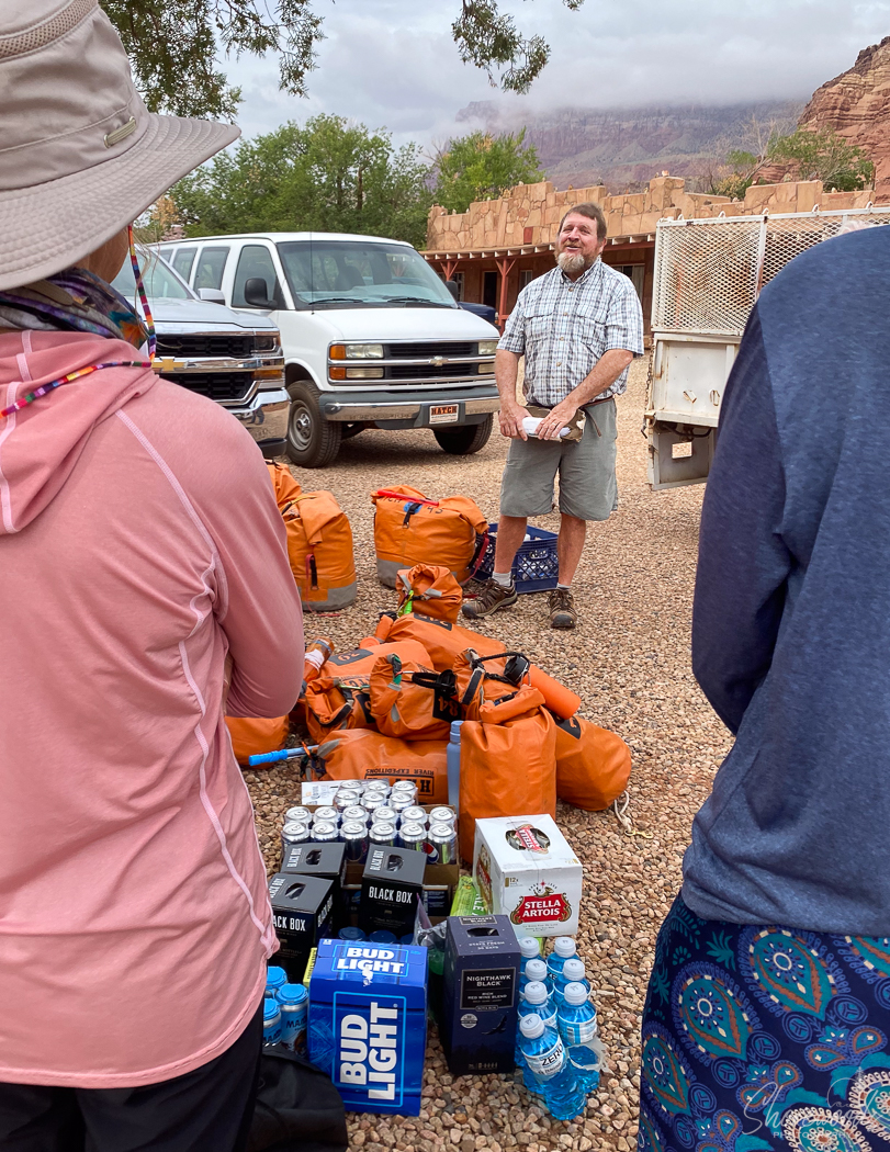 This morning we gathered at Cliff Dwellers with our gear packed in our camp “pumpkins” (large dry bags) and our day dry bag. We were welcomed by Steve Hatch who went over safety, and got us organized to head down to Lees Ferry.