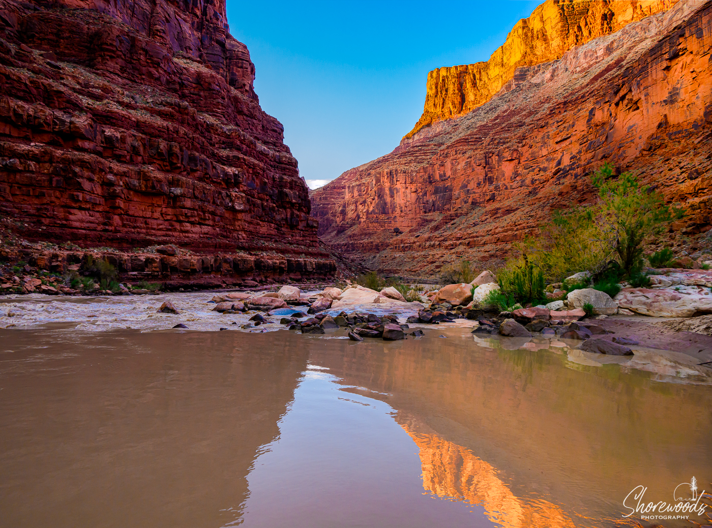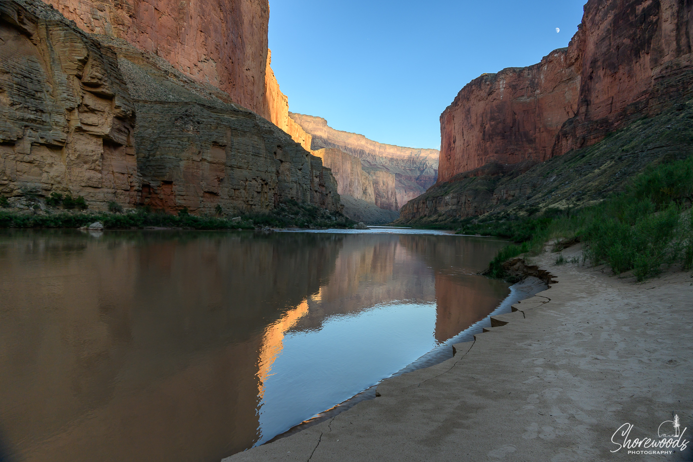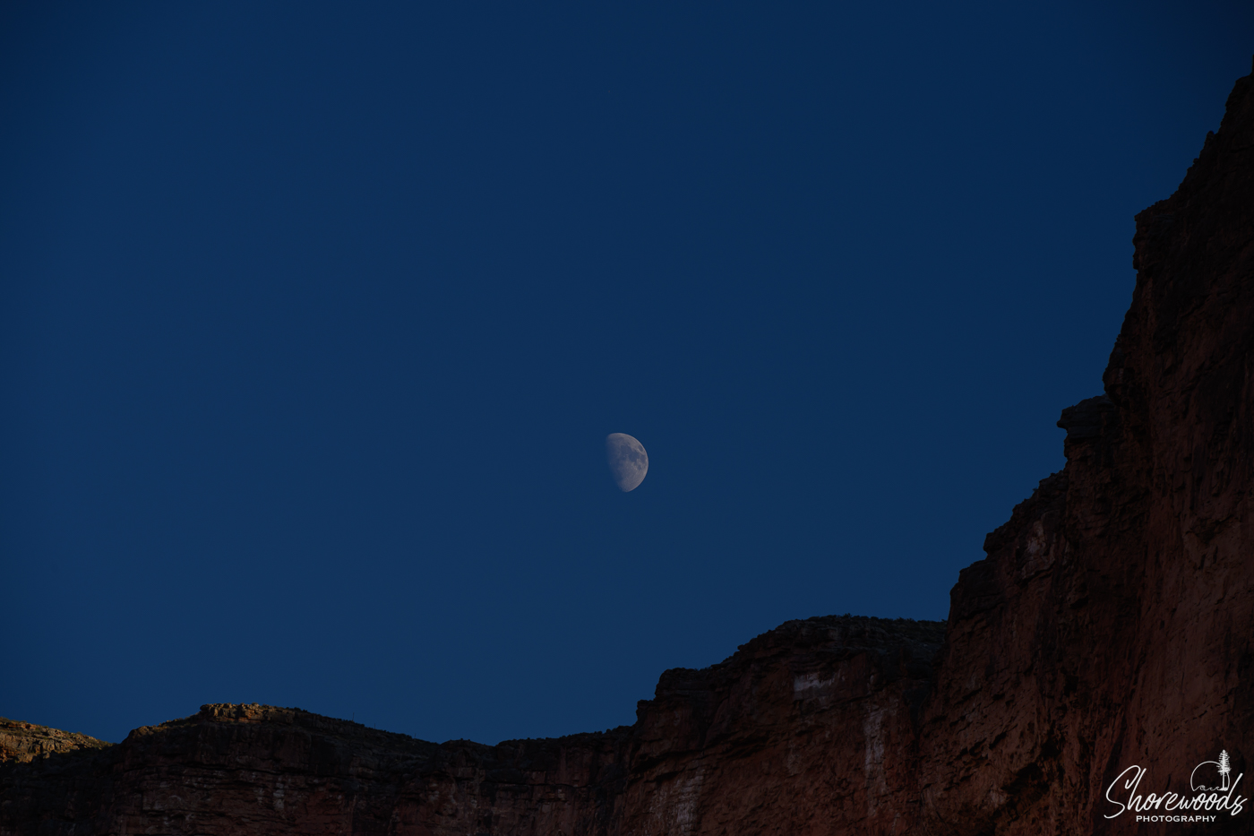 This evening we made our camp at Lower Saddle, at Mile 48 on the river. Sunset closed out the day with more beautiful water reflections, and moonrise over the Canyon wall.