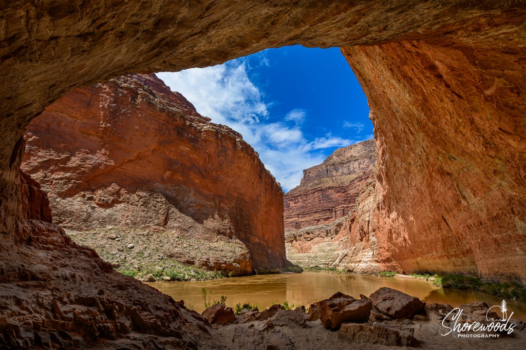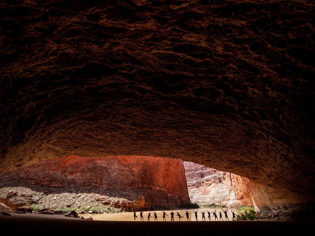 We were treated to photos and lunch at an iconic place in the Grand Canyon: Redwall Cavern at Mile 62. We enjoyed taking some photos and having the cavern to ourselves! It is most impressive! This first photo is looking up river with Redwall Cavern on the right.