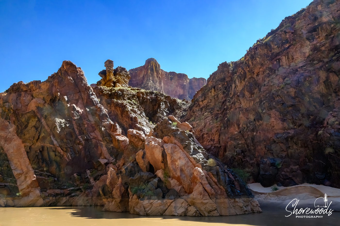 Here is a closeup, where you can make out the raft and the person on the shore; it is right across from the rock on the point on the right. This gives you some scale as to the sheer size of this place, and sometimes Grand is not a strong enough descriptor.