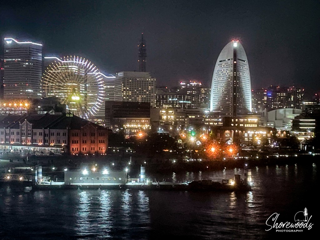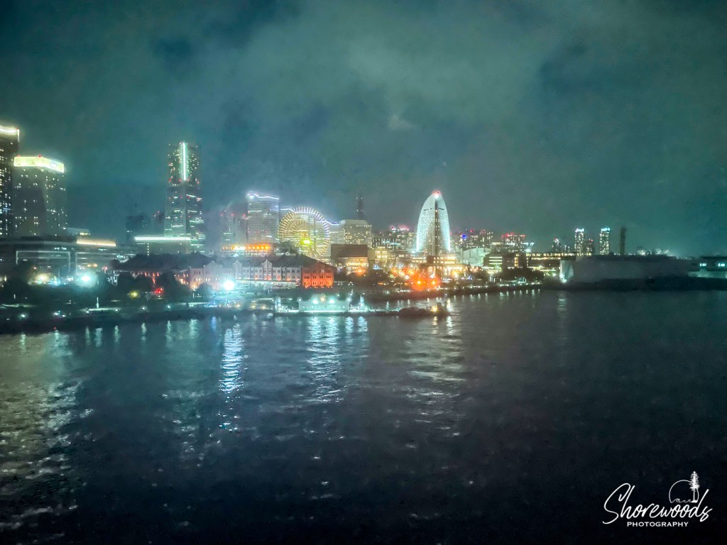 We had dinner at Blu, one of the restaurants on the ship, and were treated to a view of the illuminated coastline. The tall building on the right is our hotel, and you can see the wheel that we took photos of the night before.