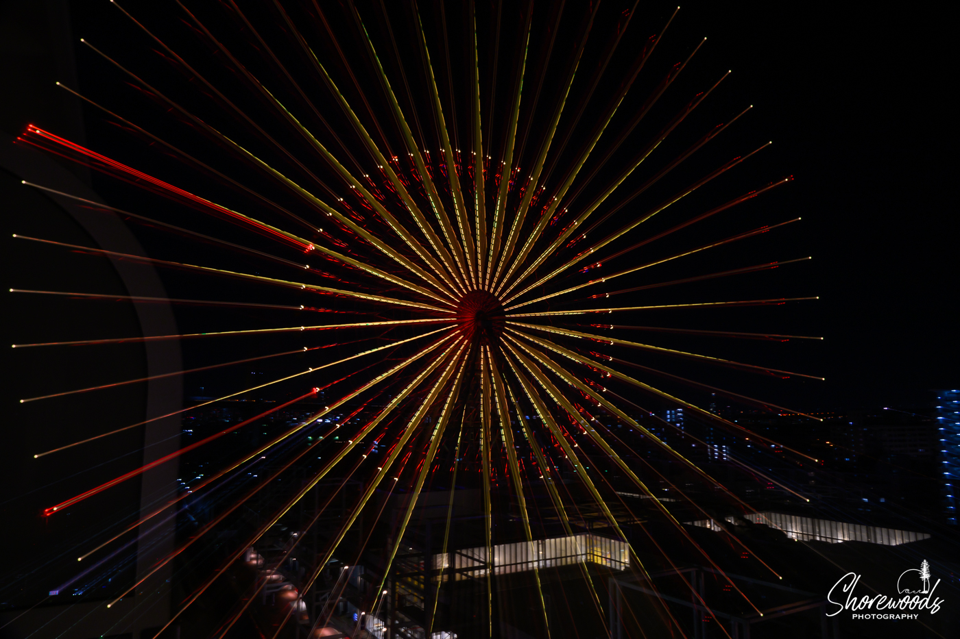 We returned to our ship, and after dinner enjoyed the night sky from our balcony. We are fortunate that our room is on the starboard side facing the port. We have a great view of the wheel and its lights, which provided for an enjoyable evening with our tripods and cameras capturing some wheel shots!
