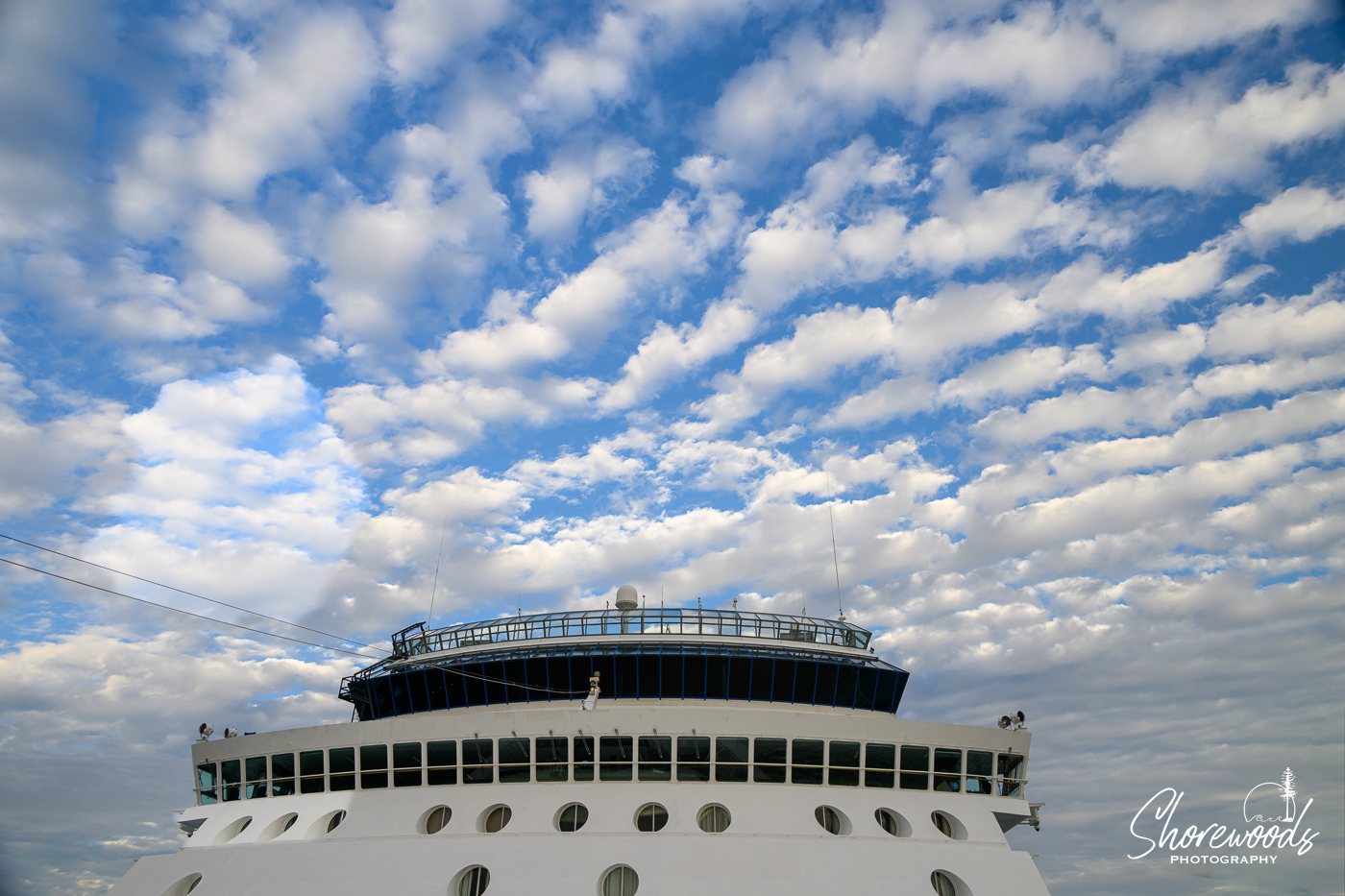 We head back to our cabin and find we have been invited to another sail away from the helipad. The sky is a beautiful texture of cloudy puffiness. The crew on the bridge have a large hand to wave goodbye to those on the dock bidding us farewell.