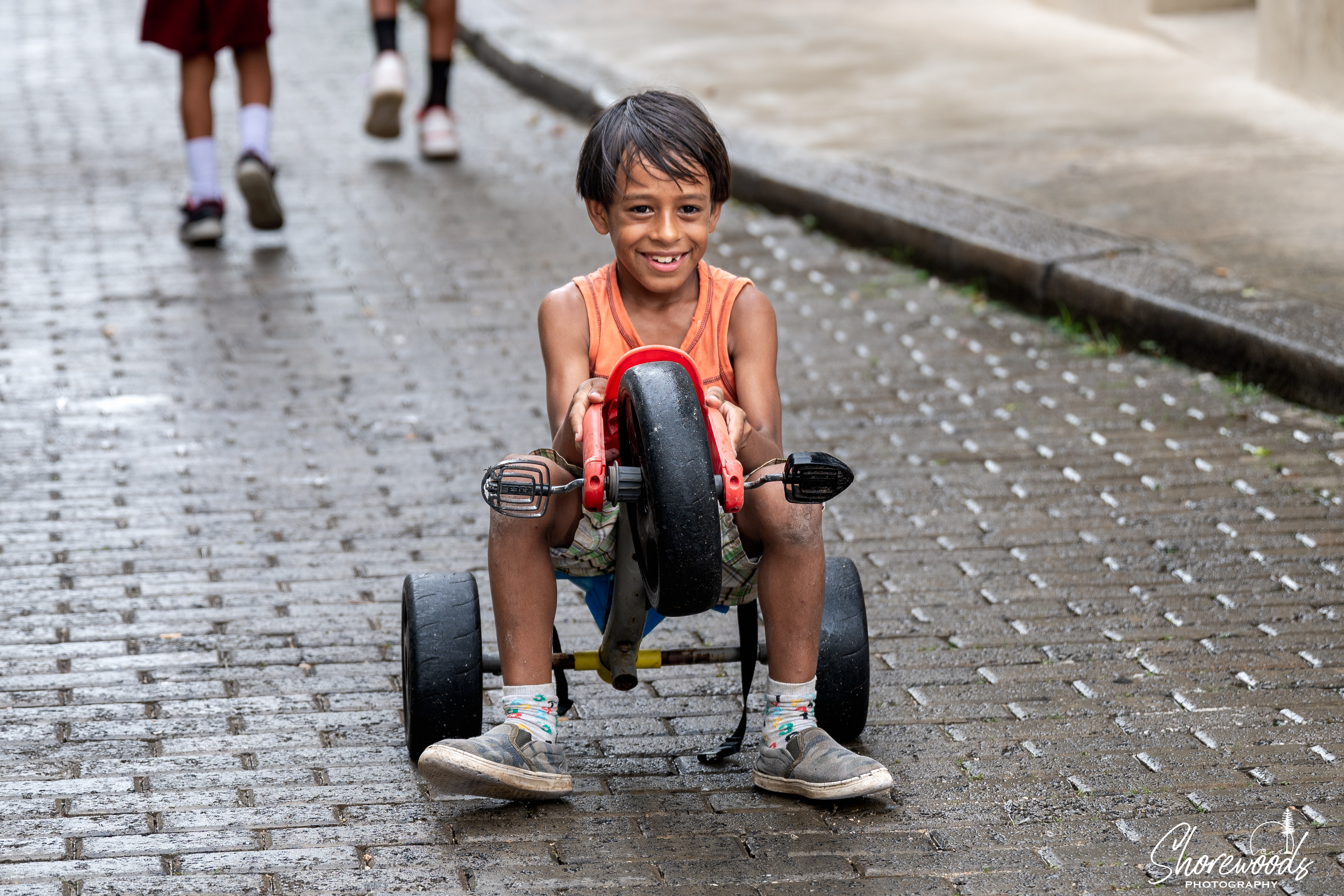 The rain lightened and we resumed our walk. We came upon a group of children riding a big wheel through puddles in the street. They were happy to pose for their pictures to be taken, and equally happy to see themselves on camera.