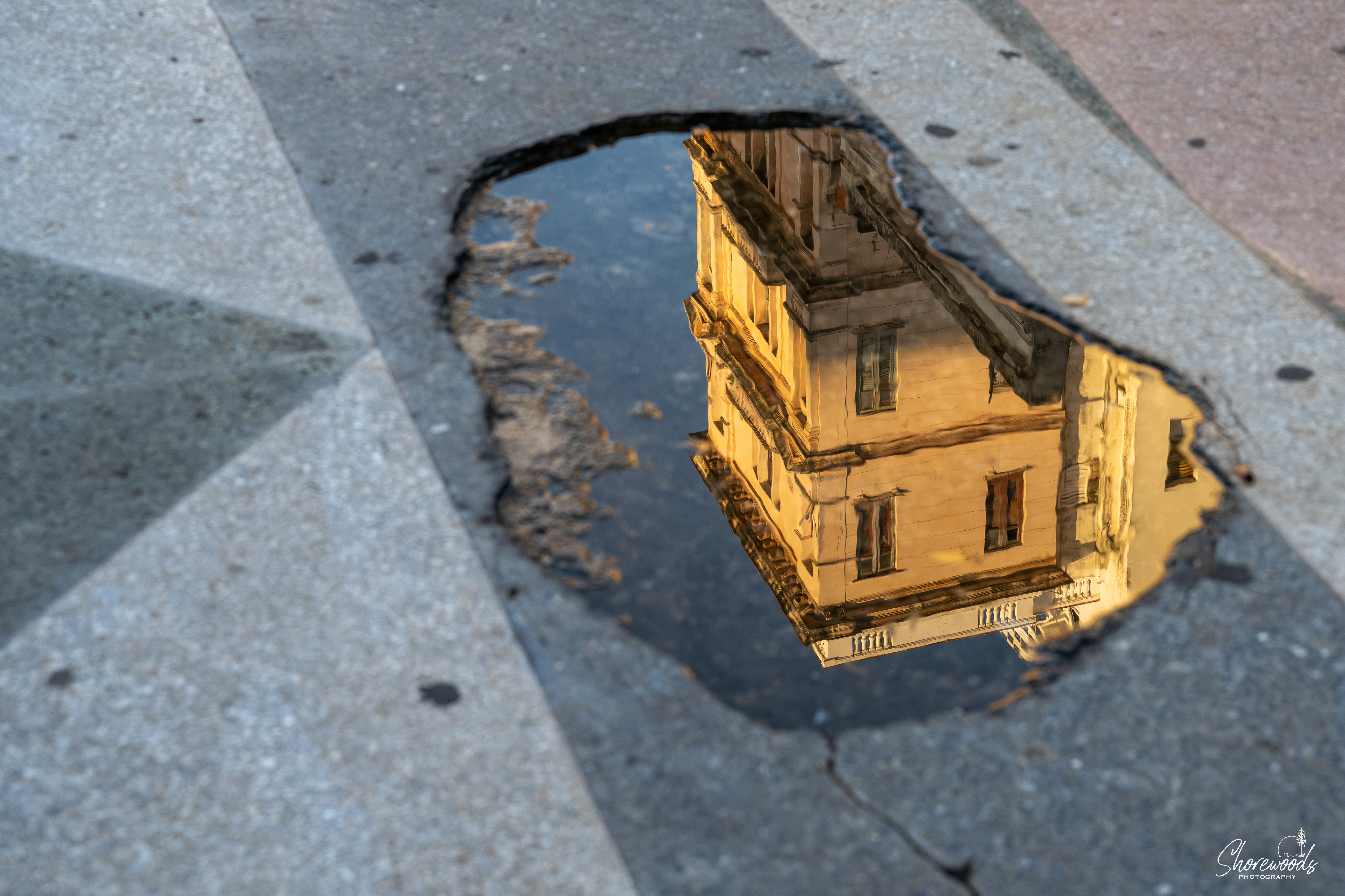 It is quiet as we stroll along, making photos of the light waking on the buildings, and reflected in puddles of leftover rain from the evening before.