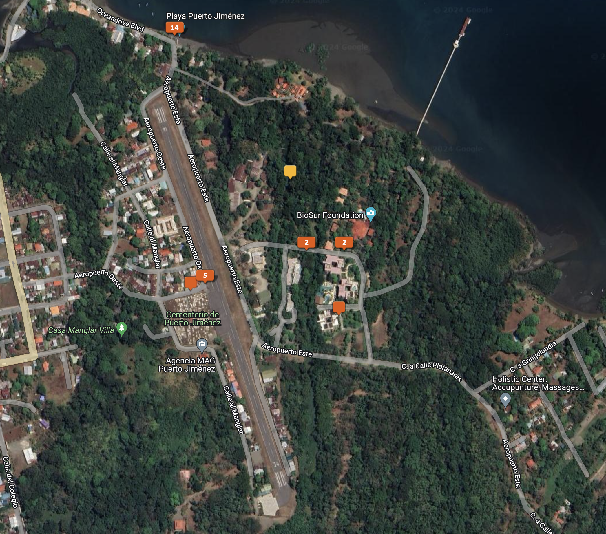 One trail brought us out onto a dock in the bay where we lingered in the salt air breezes, a welcome respite from the still humid air just inland on the path. This screenshot of our photograph map shows Botanica near the airstrip, the dock, and the many trails through the forest.